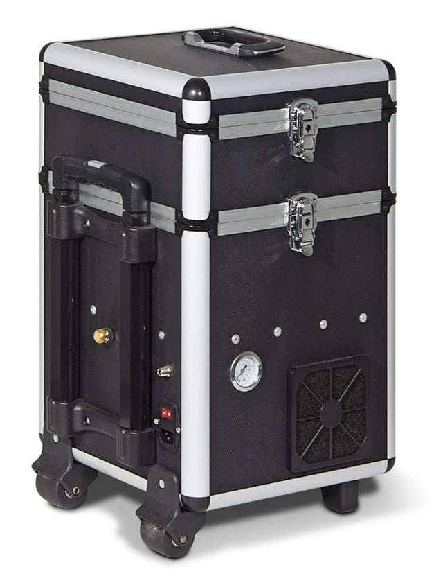 Iwata Maxx Jet is equipped with a pressure gauge that displays the tank pressure in the 2.5 liter air storage tank and the gauge on the regulator displays the working pressure. The moisture filter traps condensation within the cup delivering clean, dry air. Using the adjustment levers on the manifold, you can independently regulate the air pressure to each air hose, giving you total control. Auto shut-off technology enables the compressor to shut itself off when not in use. This feature upgrade is known to lengthen the life span of the compressor motor because it reduces the workload of the motor over time. The powerful two pole 1/6 hp motor is oil-less, has a 2.5 liter air storage tank and stays cool with the built-in internal cooling fan. The air intake filter protects the motor from dust and particulates and is designed for easy-access filter cleaning. The protective travel case includes a convenient retractable handle. The detachable top opens a handy storage tray and the case contains two built-in storage drawers. Turn the unit on and off with a convenient switch mounted into the outer case and when you are finished you can detach the power cord for convenient mobility.