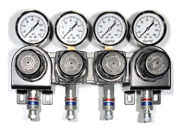 Description: Common port quad regulator setup. Each regulator adjustment controls only the gauge and coupler port for a loop system. Available in single, dual, triple, and quad setups.