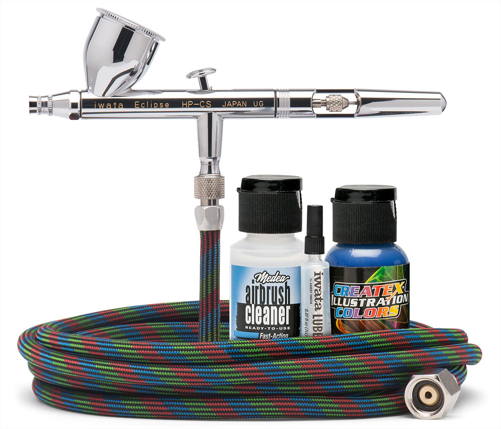 Set includes Iwata Eclipse HP-CS, Iwata Airbrush Hose, Medea Airbrush Cleaner, Com-Art Acrylic Colour in Opaque Ultramarine and an Airbrush Users Guide.