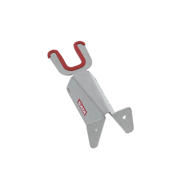 Description: SATA universal spray gun and hose holder. Super solid stainless steel with insert to protect cup from scratches. Holds all models of SATA spray guns, with or without the paint cup. Extends from wall to accommodate hanging of hose also.
