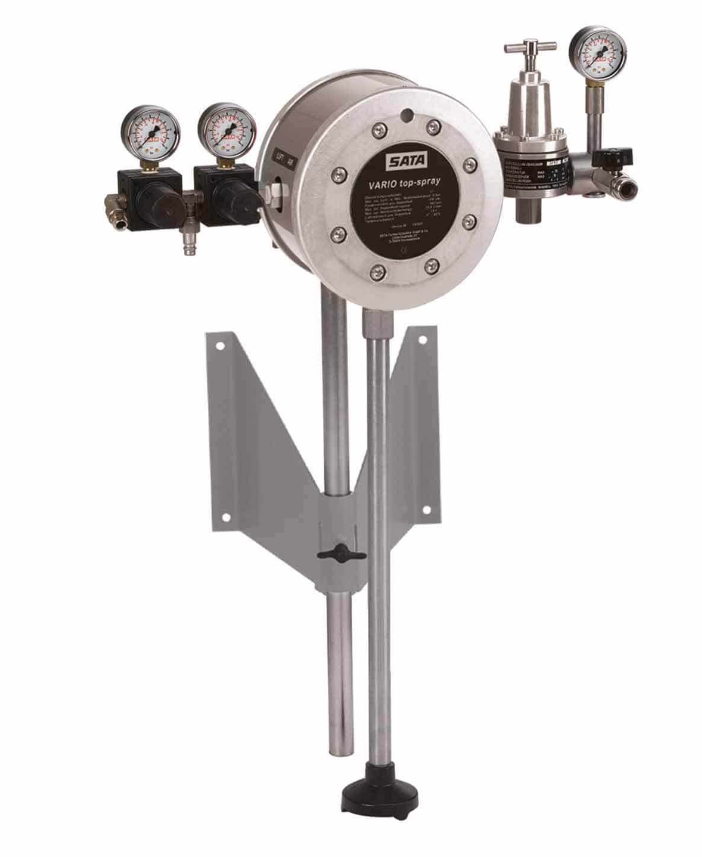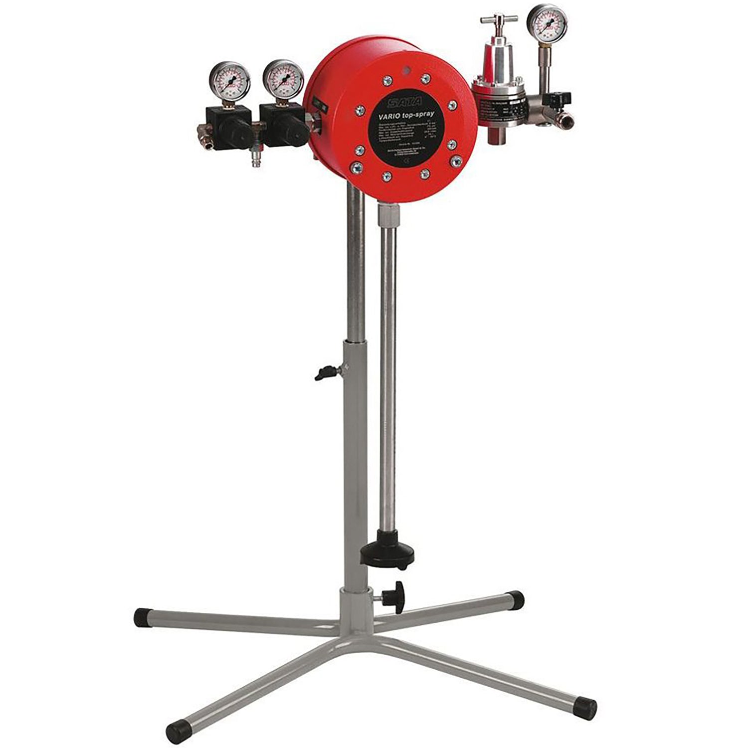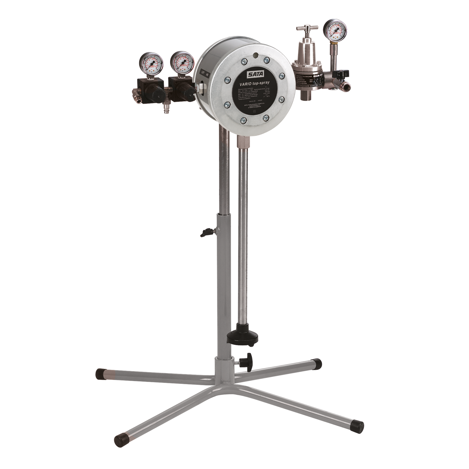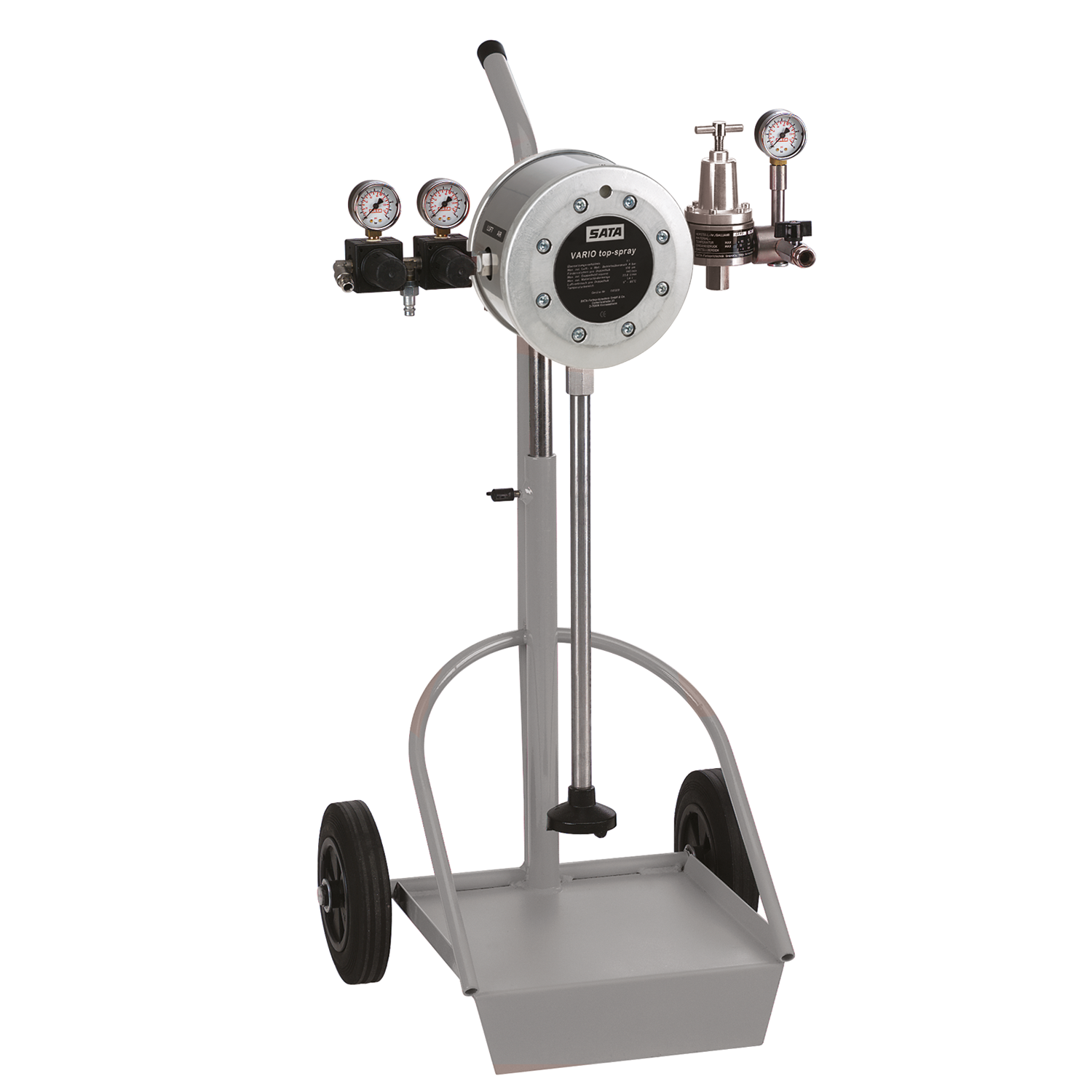 Description: 1:1 Ratio double diaphragm pump. Economical. Powerful. Versatile in use. The powerful double diaphragm pump SATA vario top spray is the ideal system for continuous processing of larger quantities of material. The SATA vario top spray is a real problem solver in vehicle and industrial painting, in machine construction as well as in wood and furniture painting. All solvent-based paint systems of the most varied viscosities and structures, but also water-based paints, can be processed without problems.