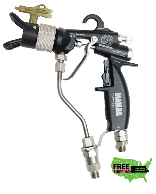 Description: The MAMBA® Mix Tech 200 bar (2900PSI) manual spray gun delivers exceptional performance, value, and finish quality. With a high transfer efficiency, the MAMBA® Mix Tech competes with other much higher-priced Graco® G40 RAC™ and G15 RAC™ spray guns.