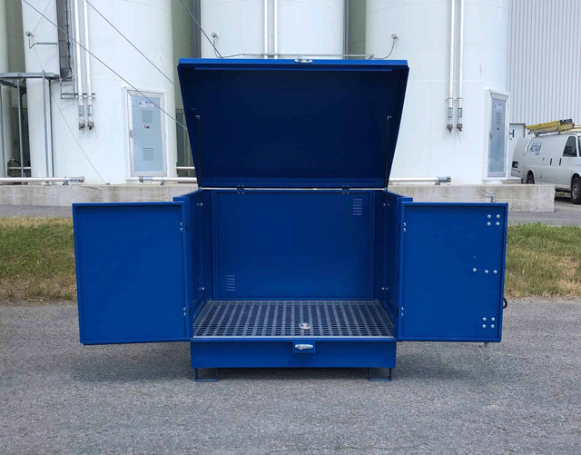 While polyethylene (LLDPE) hard-topped spill pallets typically are an excellent solution for providing sheltered spill containment, they cannot withstand extreme heat should a fire occur. Steel construction, on the other hand, provides both spill containment and protection from fire and heat.