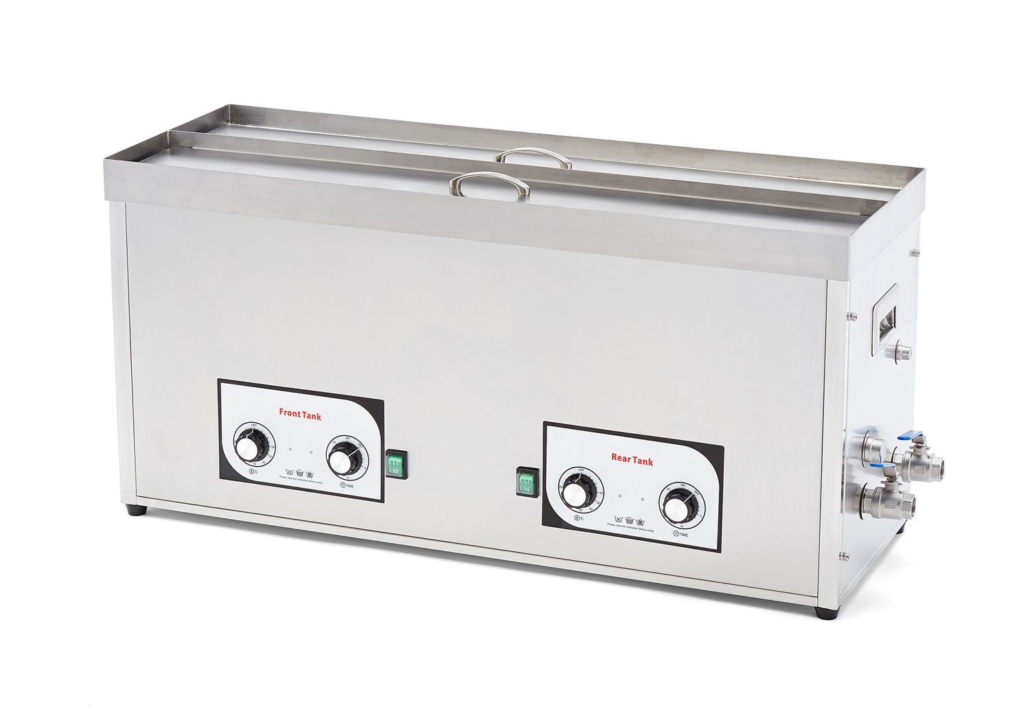 Description: Boasting 1,000 watts of ultrasonic power and 1,200 watts of heat, this new Dual Chamber model is the extended-length cleaner to have! The unique, fully welded tank design not only eliminates bulky heavy lube pan accessories, but also allows for simultaneous cleaning and lubricating of spray gun parts. It can also be set up as a clean and rinse station for parts cleaning prior to coatings or magnetic particle inspection. The baskets have convenient drain position hangers and it is plumbed for a optional filtration system and oil skimmer.