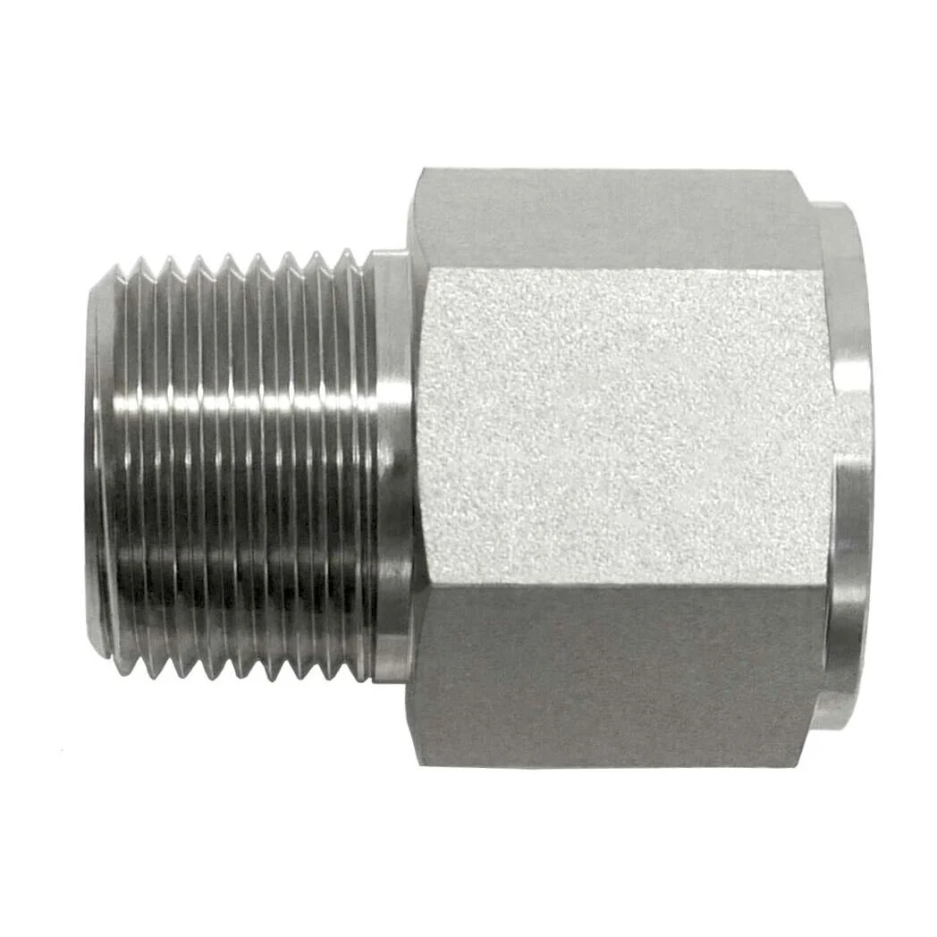 Description: Male NPT 1/4"-18 to Female BSPP 1/4"-19 Adapter, straight, stainless steel.