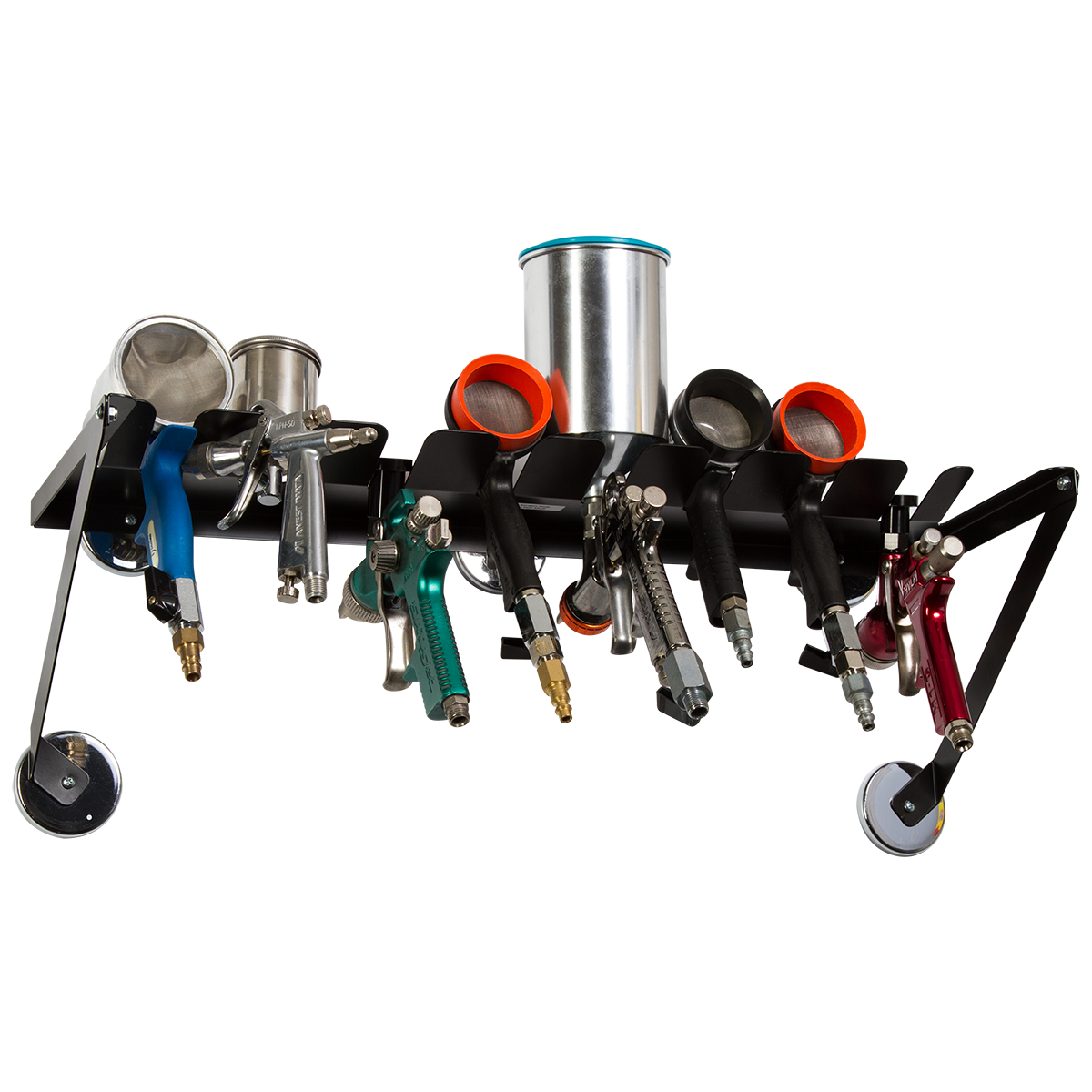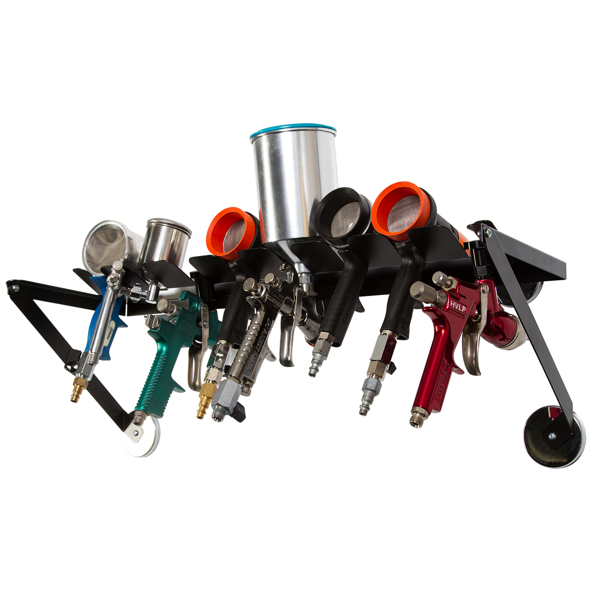 Standard spray guns (with traditional aluminum or plastic cups) and most air blowers/amps are also compatible with the 8-Position GunShelf.