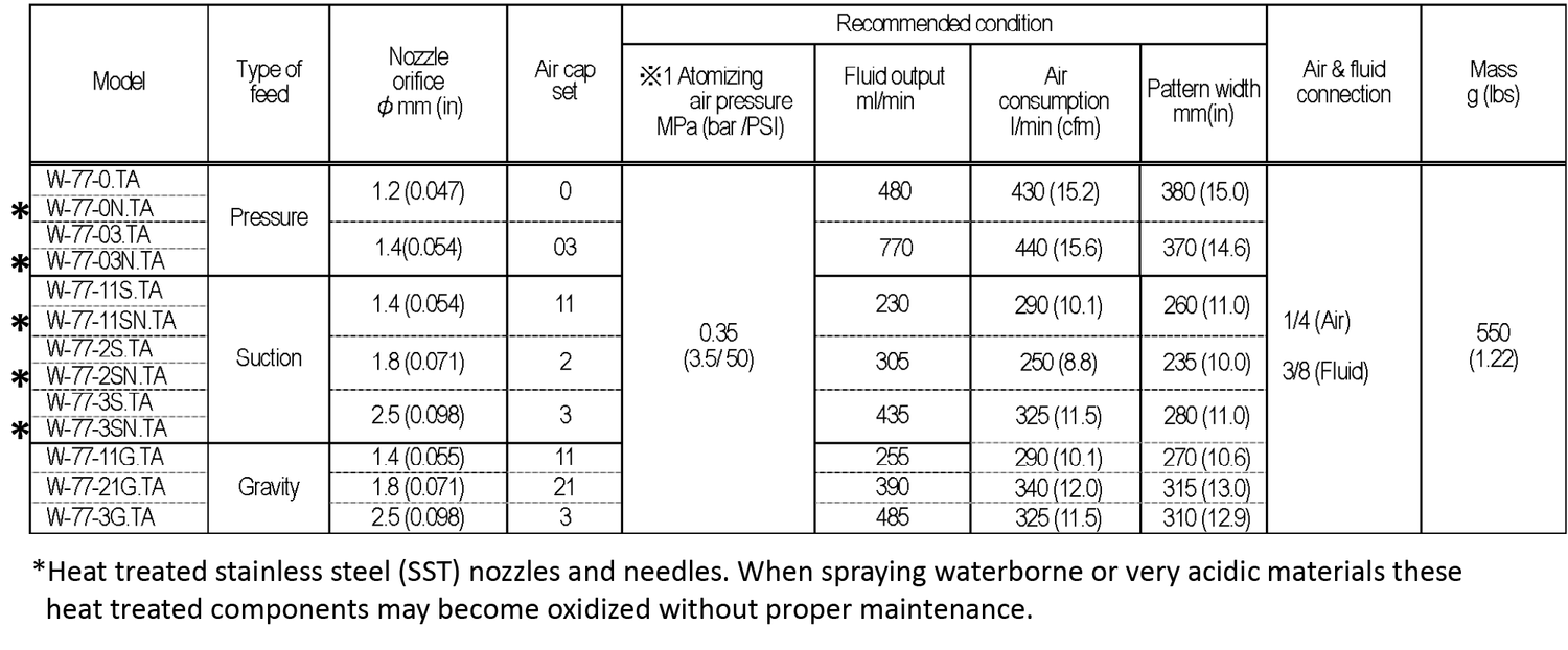 * Heat treated stainless steel (SST) nozzles and needles. When spraying waterborne or very acidic materials these heat treated components may become oxidized without proper maintenance.