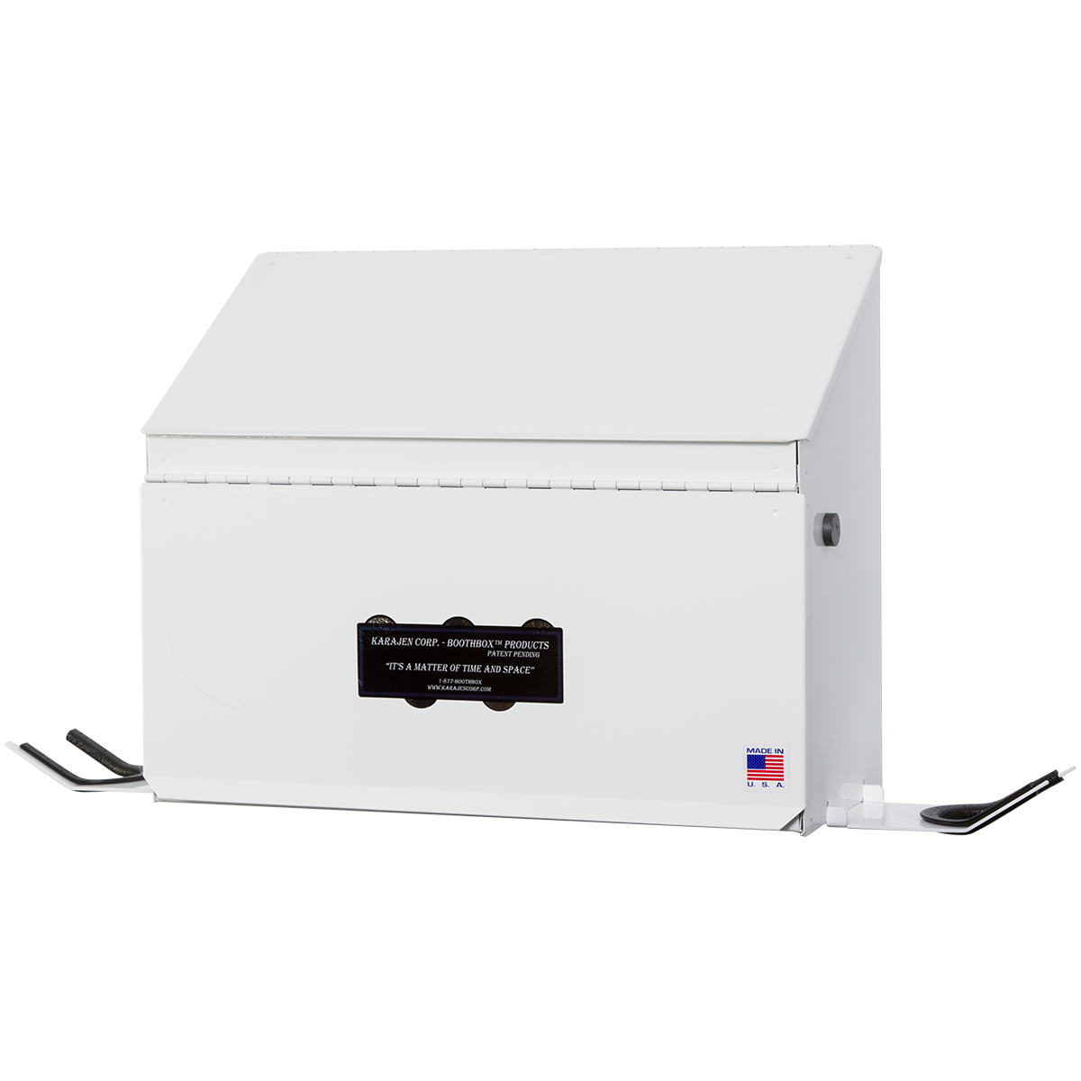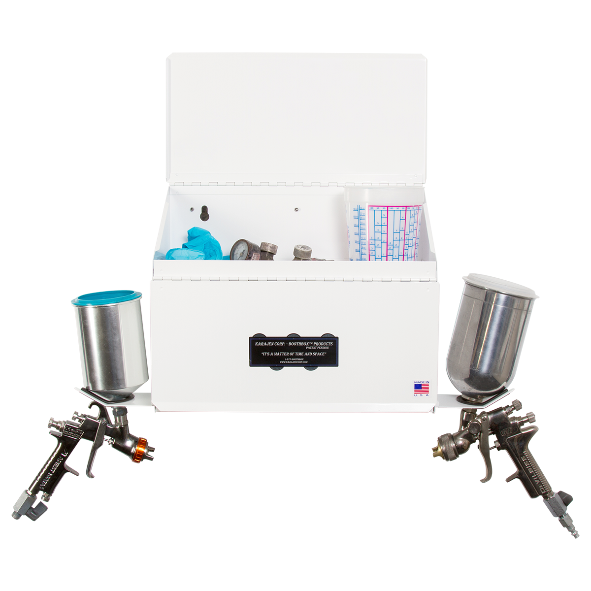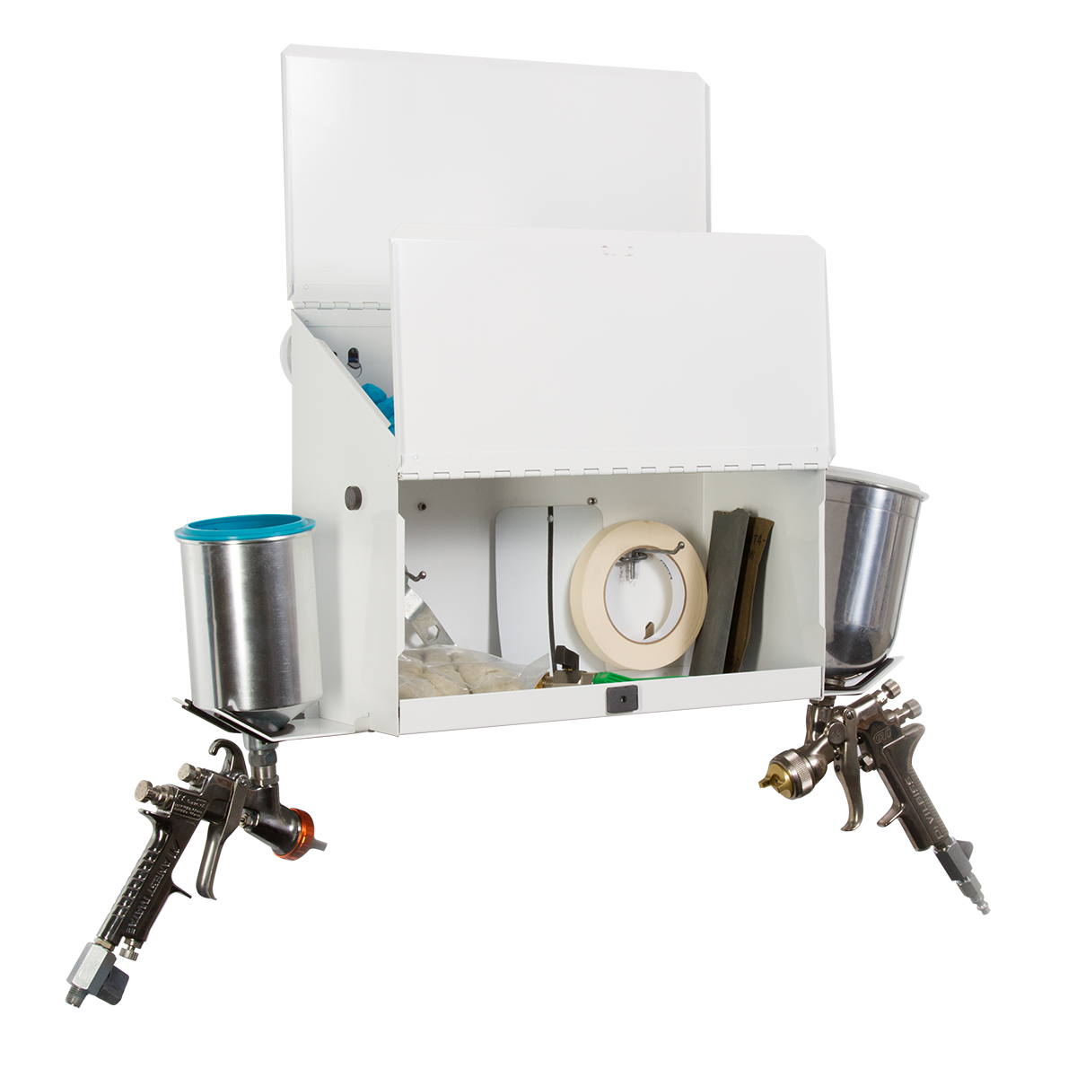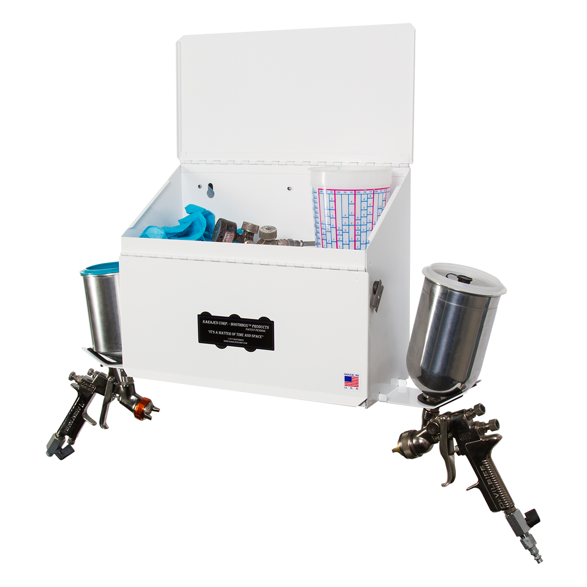 Description: The BoothBox 2 is a magnetically mounted double compartment cabinet, equipped with two spray gun hangers. It’s been designed specifically for the Automotive and Industrial Paint Industries. Eliminate unnecessary trips in and out of the spray booth during the painting process by keeping your needed items close at hand and protected from overspray damage.