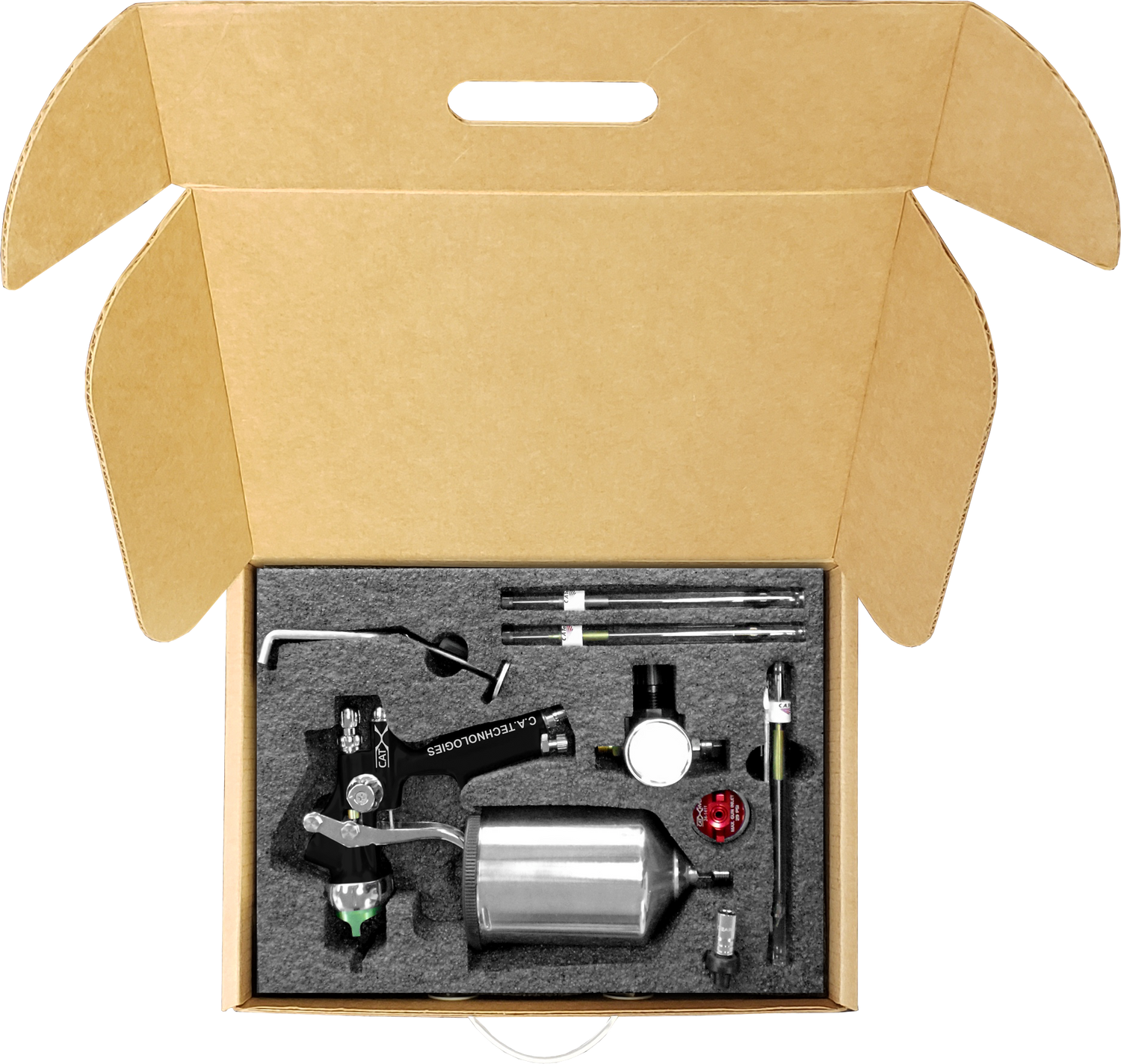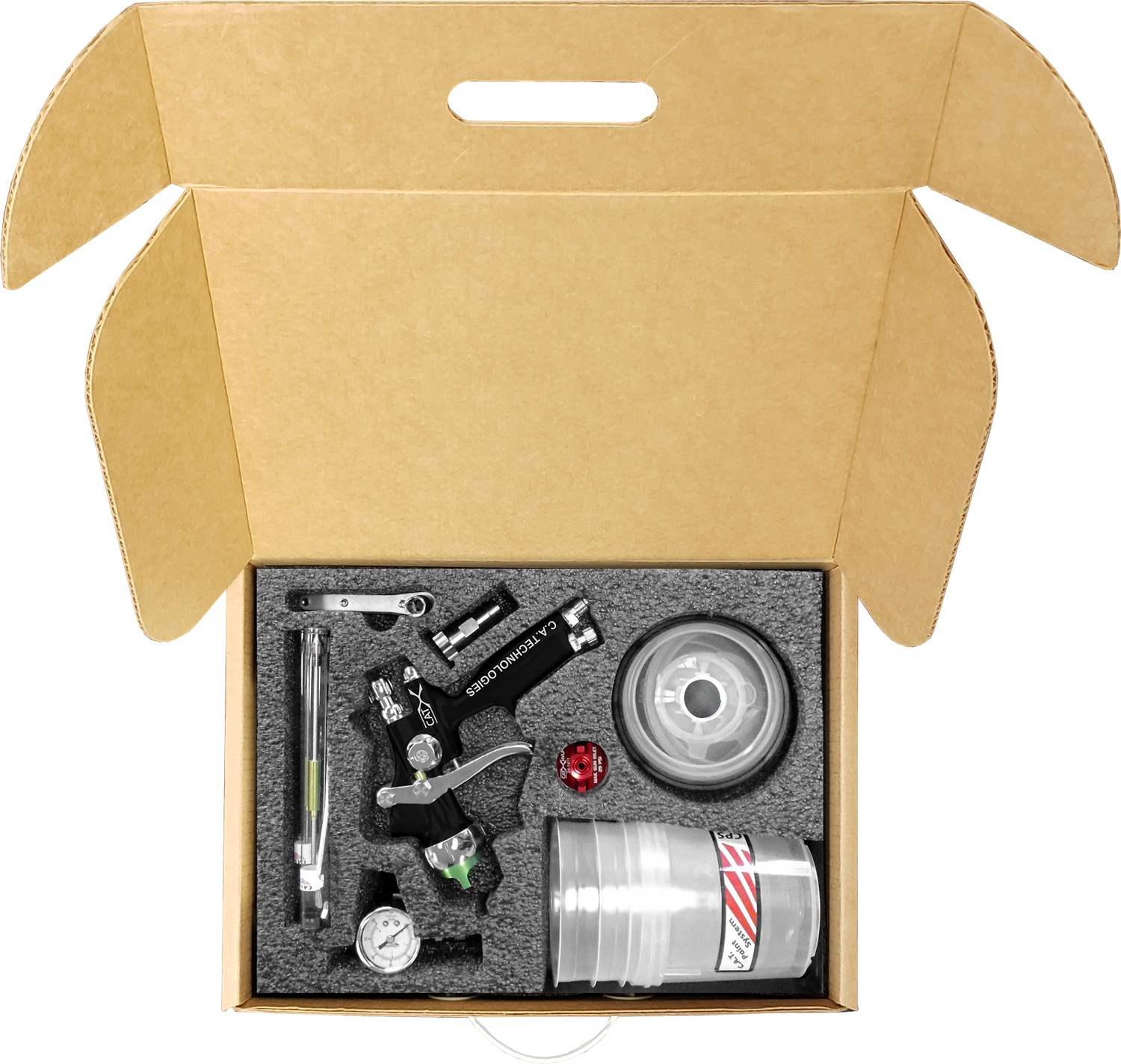 The CAT-X Gravity Pack comes in a durable plastic case that includes 3 to 4 different needle and nozzle sizes for spraying a wide range of materials along with other accessories to make this the most valuable spray gun kit in the industry.