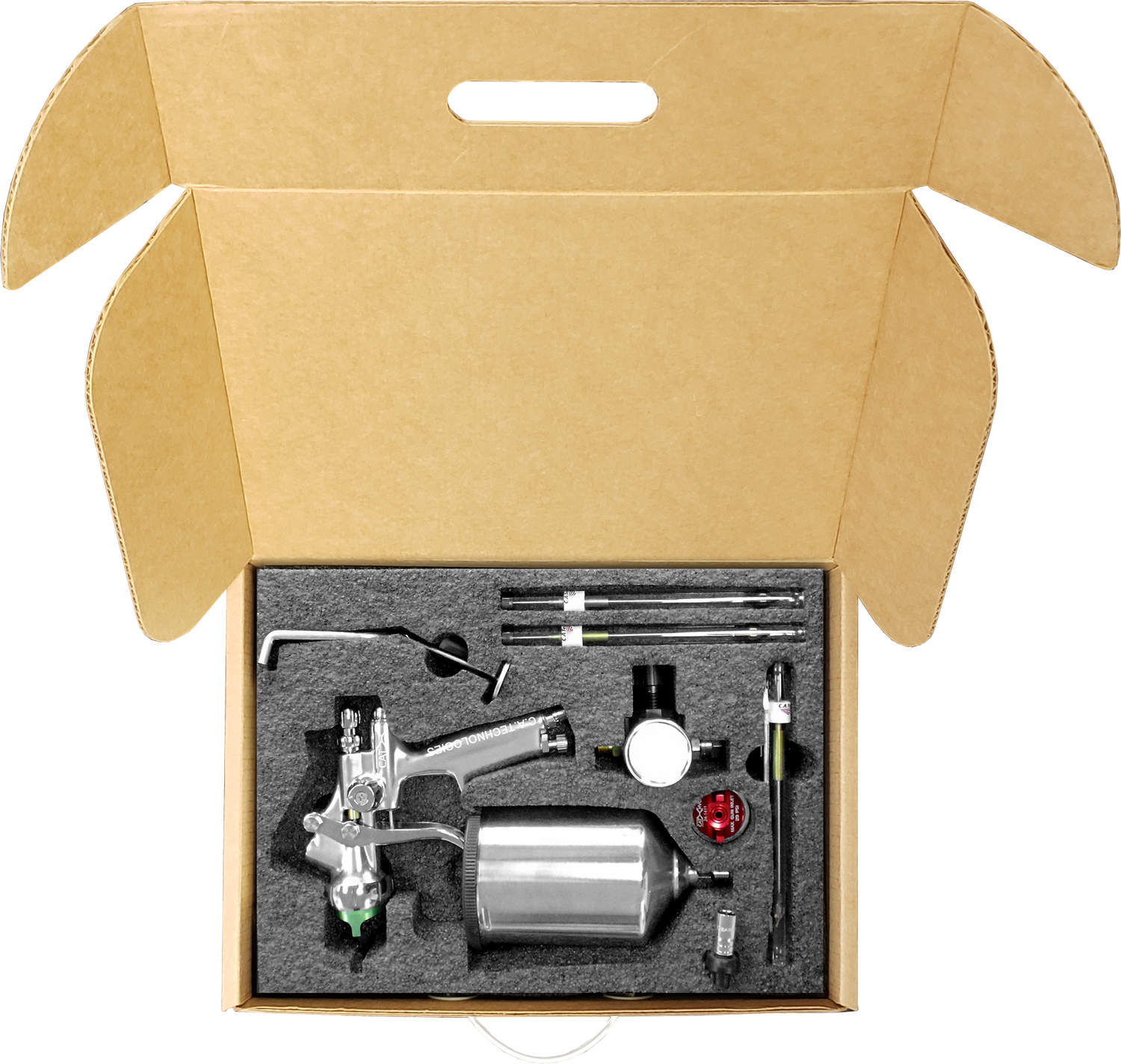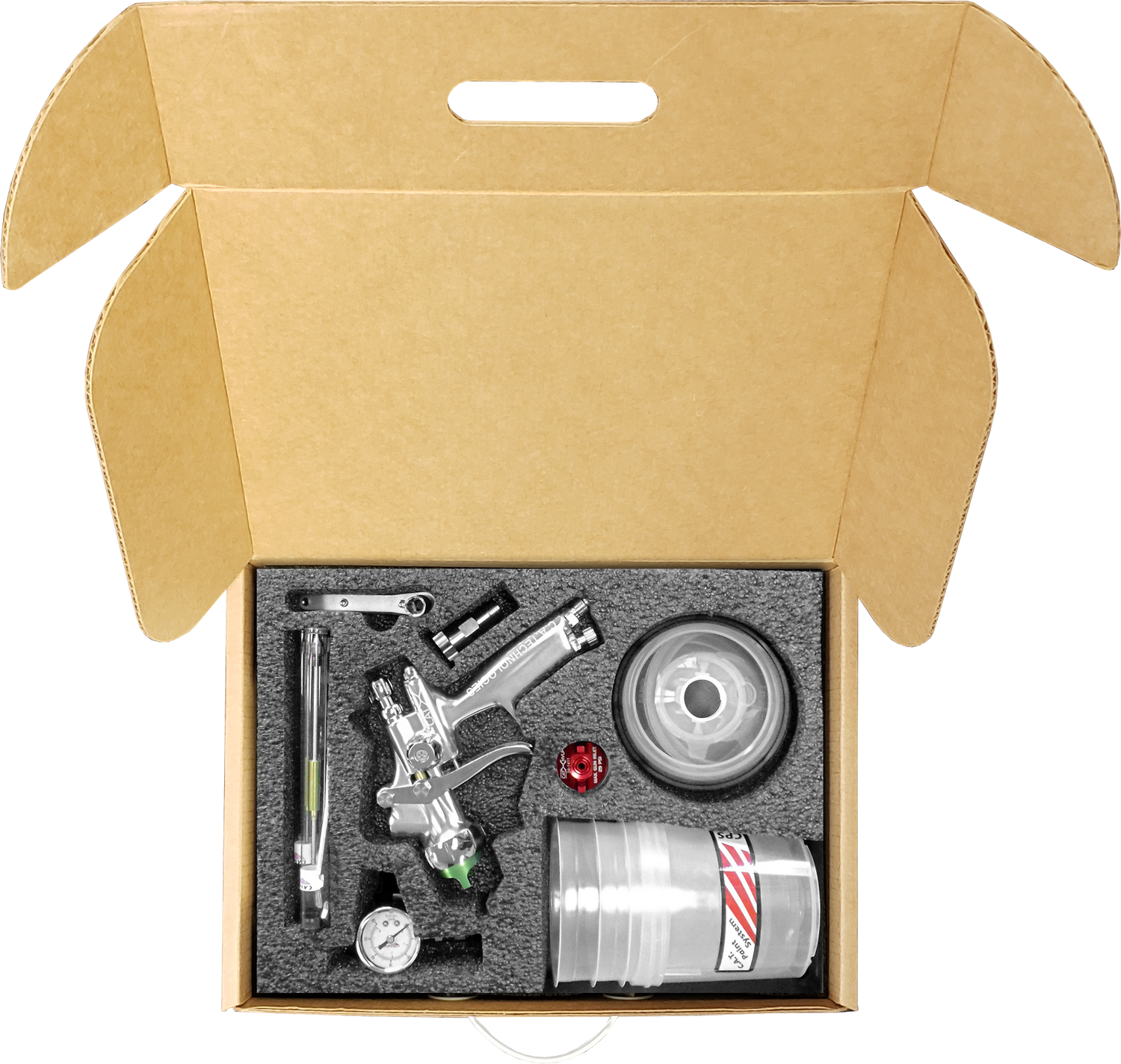 *Spray Packs pictured represent the gun and cup accurately for each - Automotive, Wood and E-Packs will include items listed above.