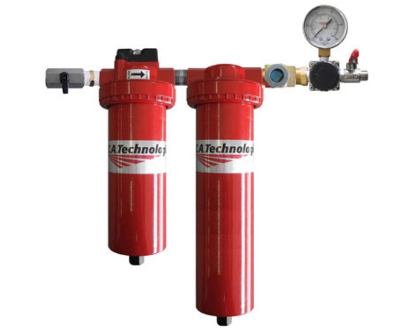 C.A. Technologies part 52-531 Air Filter Dryer. This unit is a point of use two-stage oil/water filter with a desiccant drying cartridge for single gun painting operations where dry clean air is critical, such as automobile or fine wood finishing. The desiccant unit has an indicator to show when the unit is saturated and needs replacement. The unit comes with a ball valve at the inlet and a regulator for single gun regulation. This is what all fine finishers should have. Maximum flow is 25 SCFM and rated to one (1) micron.