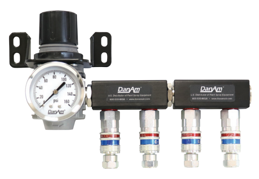 Precise compressed air pressure control is essential for the application of today’s finishes, supplied air respirators, and most air powered equipment. The Dan-Am lineup of quality regulators fit the bill. Dan-Am regulators and compressed air manifolds are manufactured from the highest quality lightweight aluminum materials available. The ½” diaphragm-type regulators are self-relieving and have a flow capacity of 142 cfm at 145 psi inlet pressure. The outlet pressure is adjustable to 125 psi, and include a 160 PSI gauge. Various setups will include manifolds with high flow (75 cfm) E-Safe couplers and nipples, sturdy wall mounting brackets, and connection fittings. All regulators require clean filtered air at the inlet to provide years of trouble-free service. Standard airflow direction is left to right, for reverse flow add RF to the end of the part number.
