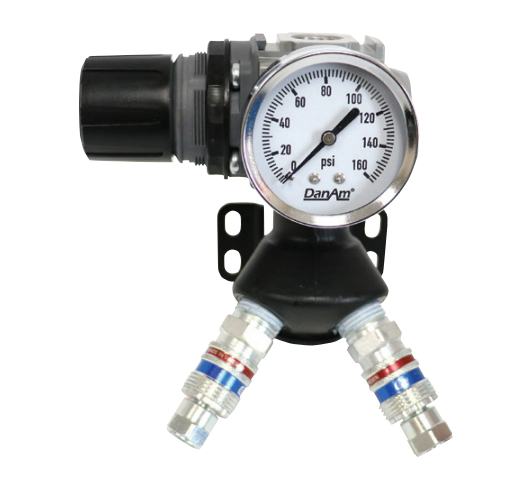 Precise compressed air pressure control is essential for the application of today’s finishes, supplied air respirators, and most air powered equipment. The Dan-Am lineup of quality regulators fit the bill. Dan-Am regulators and compressed air manifolds are manufactured from the highest quality lightweight aluminum materials available. The ½” diaphragm-type regulators are self-relieving and have a flow capacity of 142 cfm at 145 psi inlet pressure. The outlet pressure is adjustable to 125 psi, and include a 160 PSI gauge. Various setups will include manifolds with high flow (75 cfm) E-Safe couplers and nipples, sturdy wall mounting brackets, and connection fittings. All regulators require clean filtered air at the inlet to provide years of trouble-free service. Standard airflow direction is left to right, for reverse flow add RF to the end of the part number.