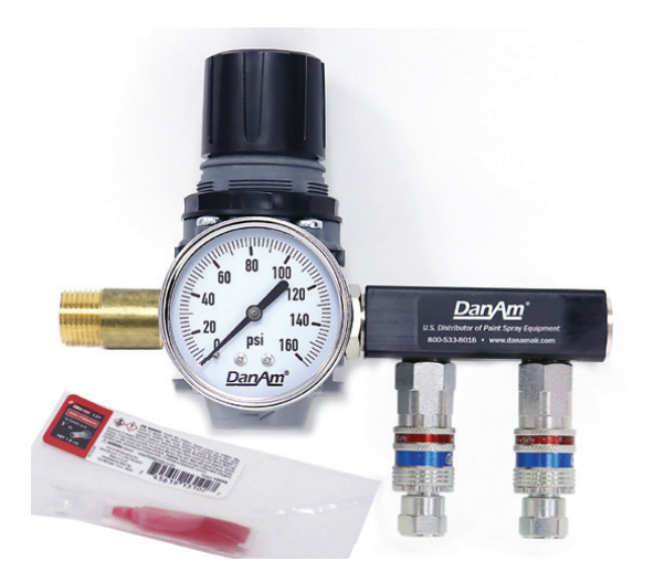 Precise compressed air pressure control is essential for the application of today’s finishes, supplied air respirators, and most air powered equipment. The Dan-Am lineup of quality regulators fit the bill. Dan-Am regulators and compressed air manifolds are manufactured from the highest quality lightweight aluminum materials available. The ½” diaphragm-type regulators are self-relieving and have a flow capacity of 142 cfm at 145 psi inlet pressure. The outlet pressure is adjustable to 125 psi, and include a 160 PSI gauge. Various setups will include manifolds with high flow (75 cfm) E-Safe couplers and nipples, sturdy wall mounting brackets, and connection fittings. All regulators require clean filtered air at the inlet to provide years of trouble-free service. Standard airflow direction is left to right, for reverse flow add RF to the end of the part number.