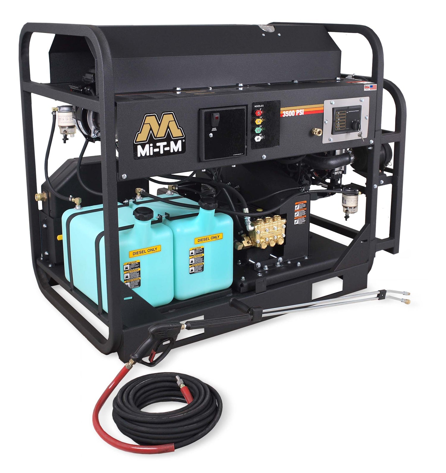 Unit Includes: Quick connect nozzles - 0°, 15°, 25° and 40° · 50-foot x 3/8-inch steel wire-braided high pressure hose with quick connects · Professional-grade insulated trigger gun with safety lock-off · Adjustable pressure insulated dual lance