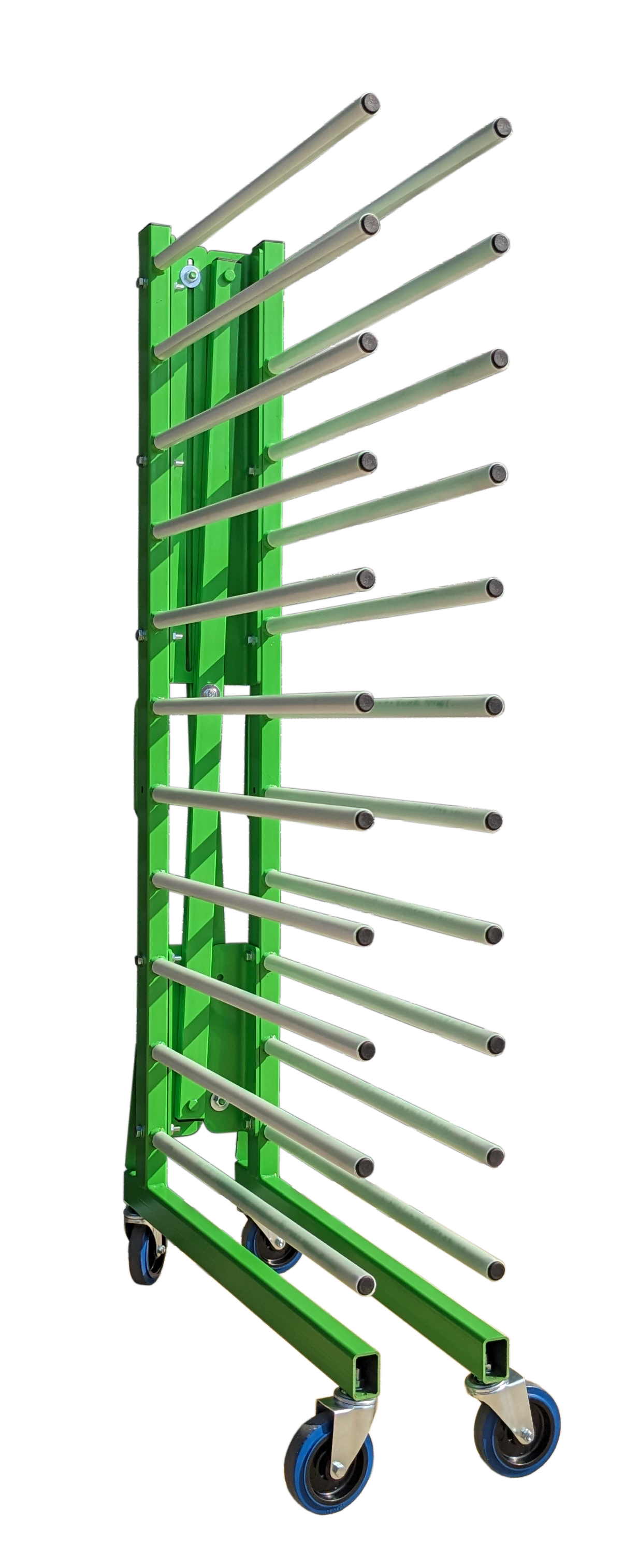 Description: 11-Shelf heavy duty drying rack ideal for drying doors and panels. Each shelf is covered in a removable plastic sleeve to provide a non-marring surface, protecting your finished or freshly painted projects. The HULKrack2™ has a powder coated finish for durability. 4 heavy-duty caster wheels provide easy transportation around your shop.