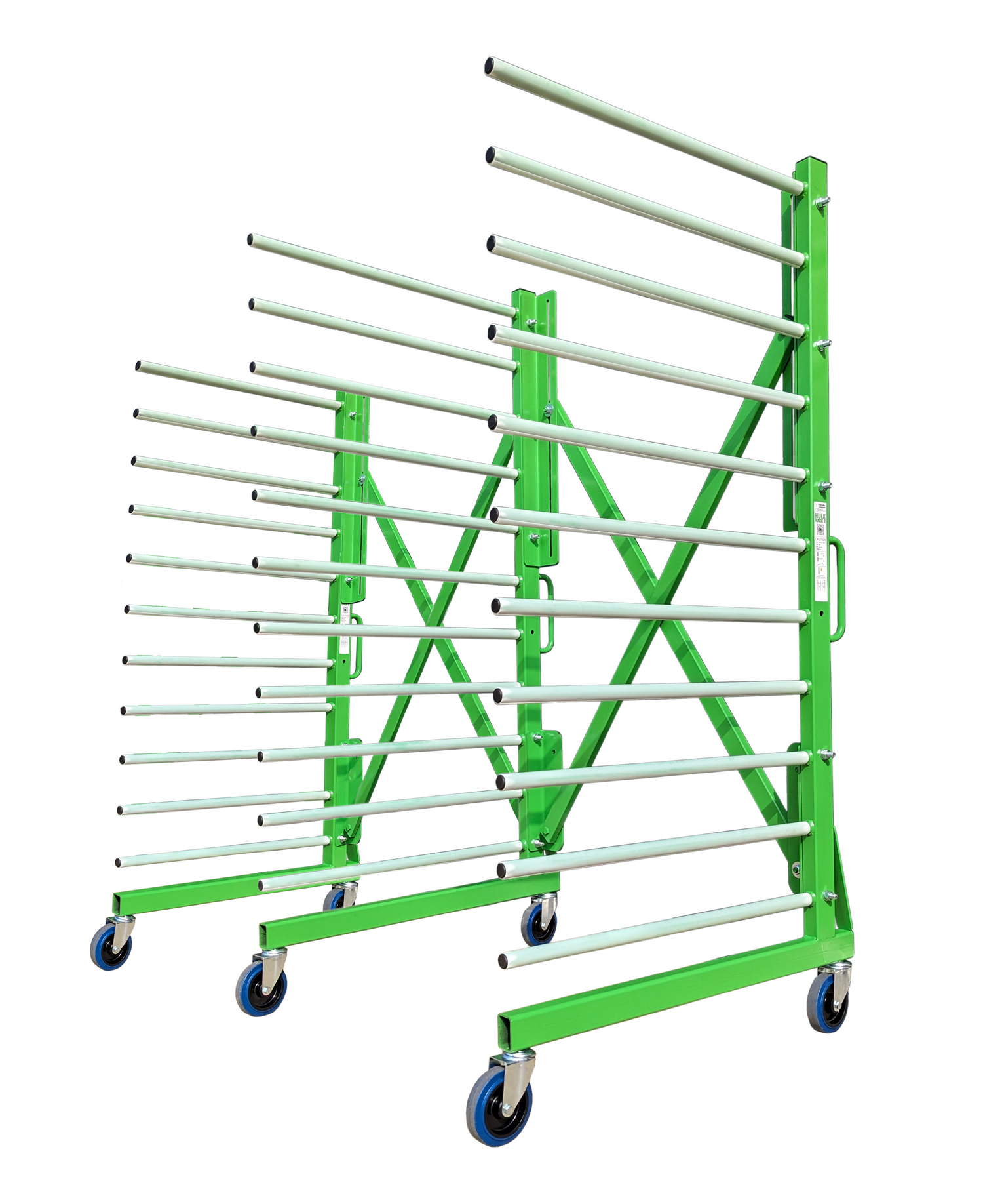 Description: 11-Shelf heavy duty drying rack ideal for drying doors and panels. Each shelf is covered in a removable plastic sleeve to provide a non-marring surface, protecting your finished or freshly painted projects. The HULKrack2™ 3XL has a powder coated finish for durability. 6 heavy-duty caster wheels provide easy transportation around your shop.