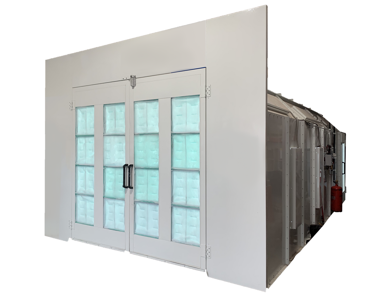 - White Powder Coated Finish - ultra white inside and out of the spray booth. cover all wall panels, doors frame, floor channels and ceiling panels.