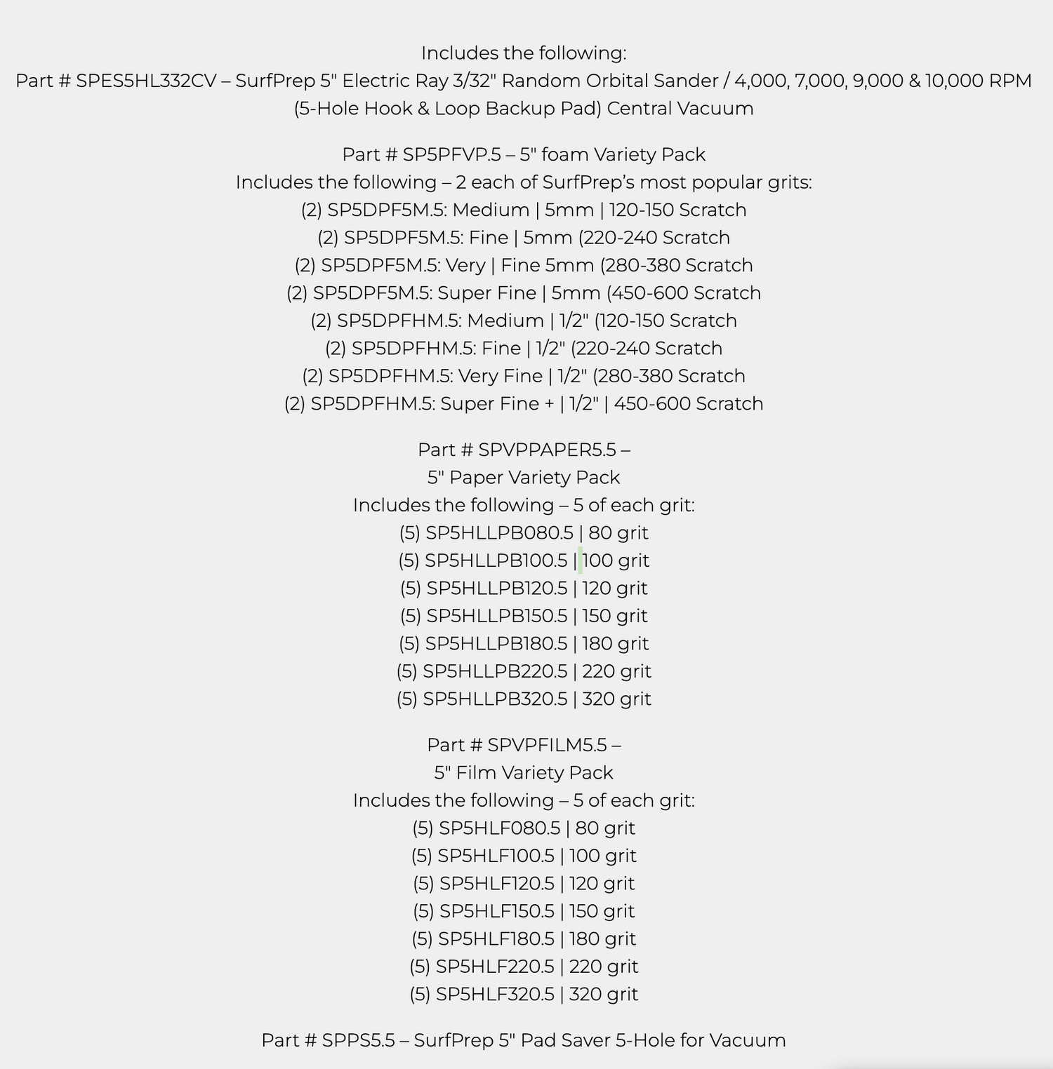 Lastly, you need to decide if you will be using a vacuum or not. Clean sanding has become more popular since OSHA classified wood dust as a carcinogen. Vacuums systems will keep your sanding area cleaner, especially if you are sanding on-site. Check out our vacuum accessories page if you already own a vacuum system and need to connect your SurfPrep sander to it. Your kit will come with a foam variety pack, film variety pack, as well as accessories. Once you choose the three options below, a description will pop up to show you exactly what to expect in your kit!