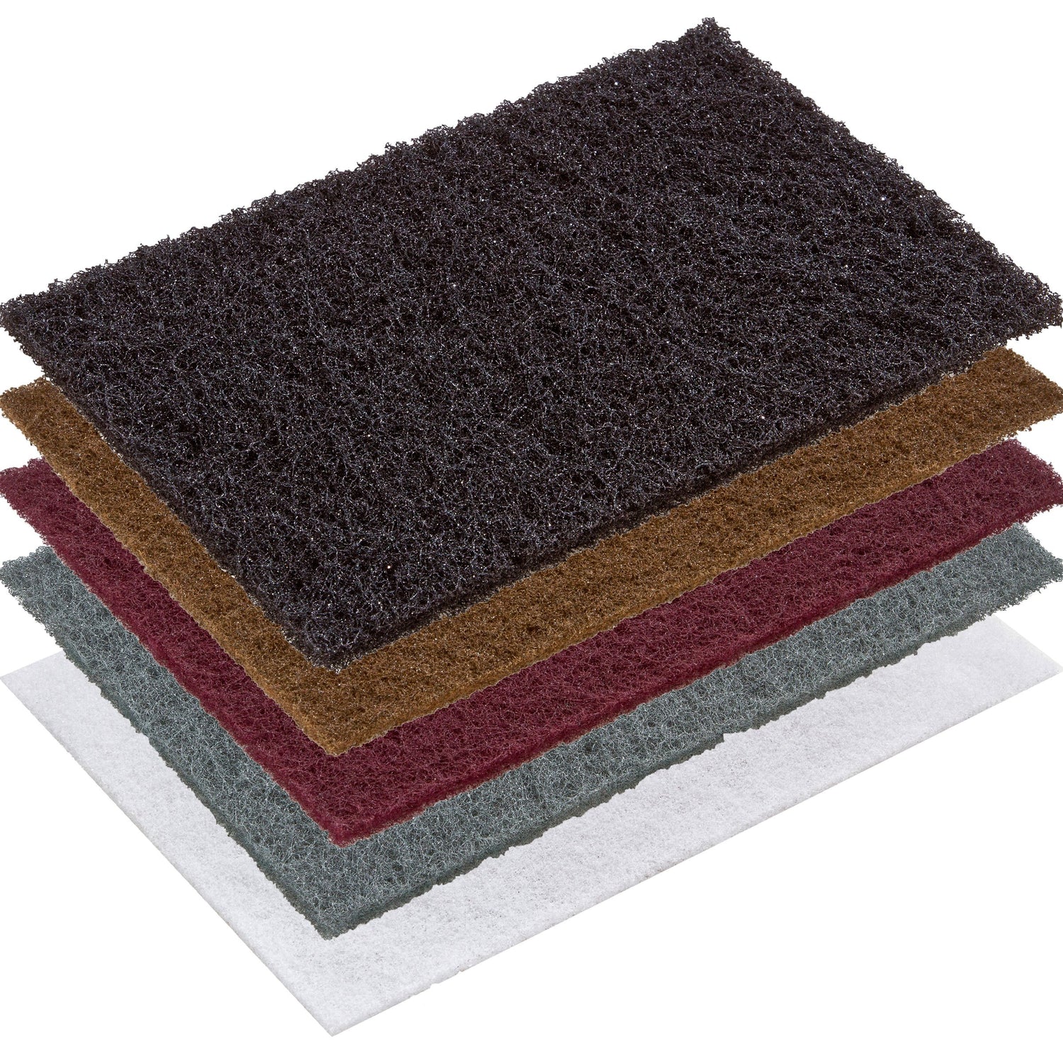 Pad Size: 6" x 9" Non-Woven Hand Pads. 60 Pads/Box Exception - Black (50 Pads/Box). MEDIUM 120 Grit S/C This black non-woven pad IS versatile for almost any general purpose sanding and cleaning solution. It can be used for anything from cleaning a BBQ to removing rust. Applications: Cleaning, deburring, finishing, preparing surfaces for painting, and removing rust Uses: General Purpose Abrasive: Silicon Carbide (S/C) Product Weight: 1.345 oz 50 Pads/Box VERY FINE 320 Grit A/O Maroon pads have a multitude of uses, from defuzzing of white wood to scuff sanding between sealer coats on wood. These are also used in the automotive industry for prepping metal surfaces before paint. Applications: Cleaning, wood finishing, automotive finishing, plastics Uses: Multi-purpose Abrasive: Aluminum Oxide (A/O) Product Weight: 0.785 oz 60 Pads/Box VERY FINE 320 Grit A/O (Extra Spray) Maroon pads have a multitude of uses, from defuzzing of white wood to scuff sanding between sealer coats on wood. These are also used in the automotive industry for prepping metal surfaces before paint. The 'XS' means 10% 'extra spray' of A/O on the pad. This pad will outlast our original (SPM) non-woven hand pad because of the extra minerals sprayed. Applications: Cleaning, wood finishing, automotive finishing, plastics Uses: Multi-purpose Abrasive: Aluminum Oxide (A/O) Product Weight: 0.825 oz 60 Pads/Box ULTRA FINE 800 Grit S/C (Extra Spray) This high grit silicon carbide hand pad is perfect for scuffing automotive fillers and matting car paint. Can also be used for wood waxing and scuff sanding when wiping stain. The 'XS' means 10% 'extra spray' of S/C on the pad which outlasts pads that don't have extra spray. Applications: Cleaning, wood finishing, automotive finishing, plastics Uses: Finishing metals, woods, plastics, composites Abrasive: Silicon Carbide (S/C) Product Weight: 0.405 oz 60 Pads/Box Non-Abrasive (No grit) For use with cleaning compounds on all types of surfaces. This pad holds compound uniformly without saturation and will not scratch surfaces. It is ideal for cleaning car windows or buffing with wax on wooden surfaces. Applications: Cleaning, windows, waxing, automotive, woodworking Uses: Fine finishing & polishing Abrasive: No abrasive/grit Product Weight: 0.4 oz 60 Pads/Box COARSE EXTRA CUT 80 Grit A/O This brown pad is the most aggressive and heavy duty non-woven option SurfPrep offers. It is excellent for the removal of heavy rust of metals. It resists loading and can be used wet or dry for a wide range of sanding applications. Applications: Deburring metal, rust removal Uses: Heavy duty construction Abrasive: Aluminum Oxide (A/O Product Weight: 1.465 oz 60 Pads/Box.