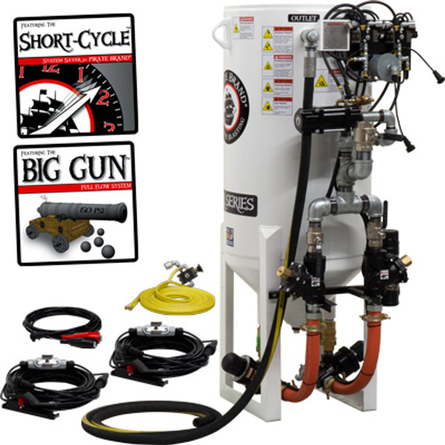 Pirate Brand, S-Series, Short-Cycle™ Series - 10 CU FT., DOUBLE OUTLET W/ ABRASIVE CUT-OFF (Cord Mounted) - Blast Pot, STATIONARY, Pressure RELEASE System, 12VDC Electric Controls is backordered and will ship as soon as it is back in stock.