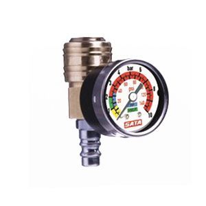Description: High-volume in-line pressure gauge with unrestricted airflow to the spraygun (non-adjustable). HVLP and RP color-coded pressure gauge face with a high flow coupler and nipple.