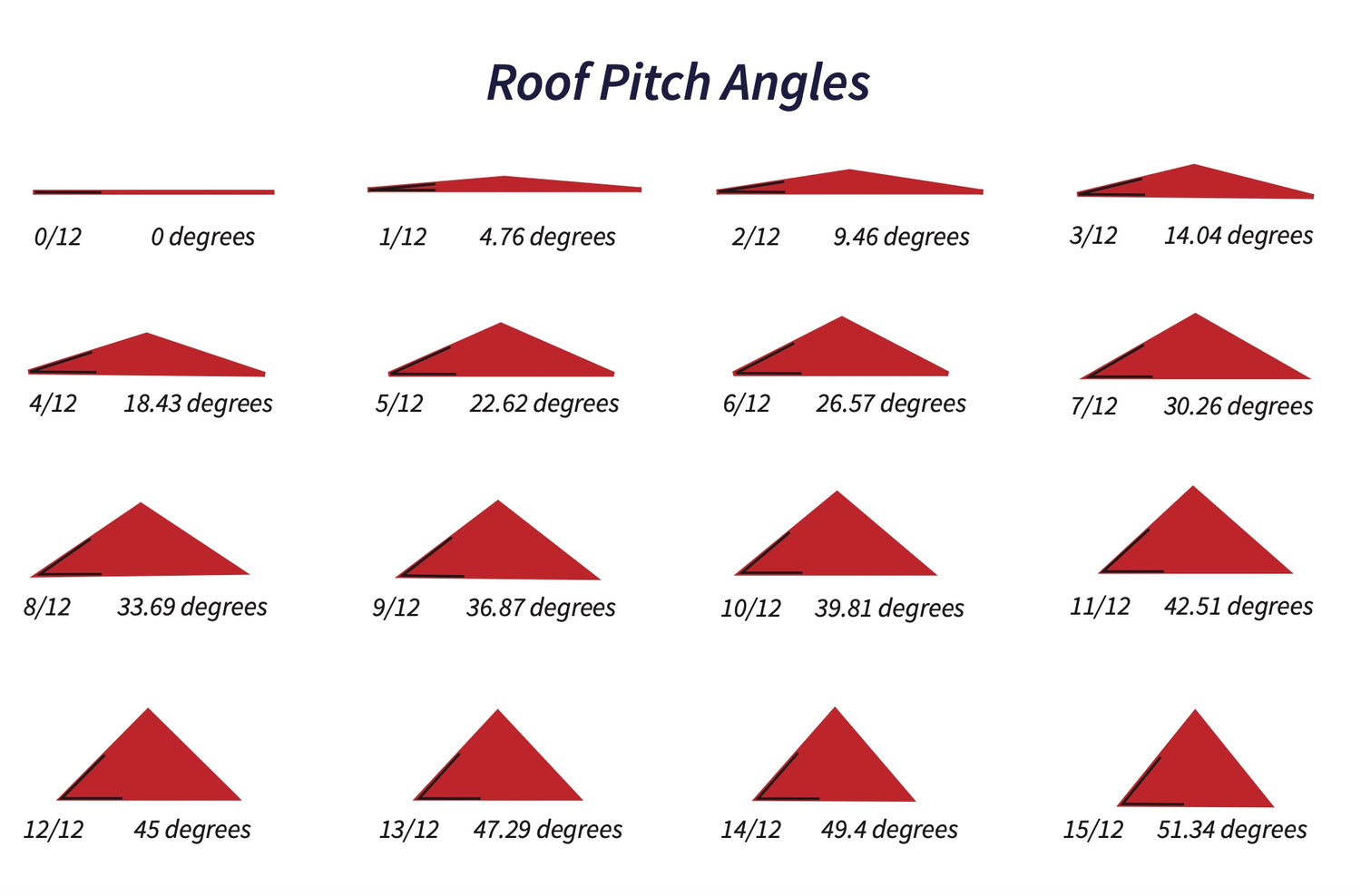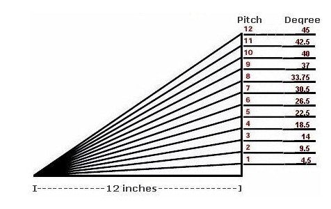 Roof Pitch = Height difference in one foot. A 4" rise in a 12" span is a 4/12 pitch.