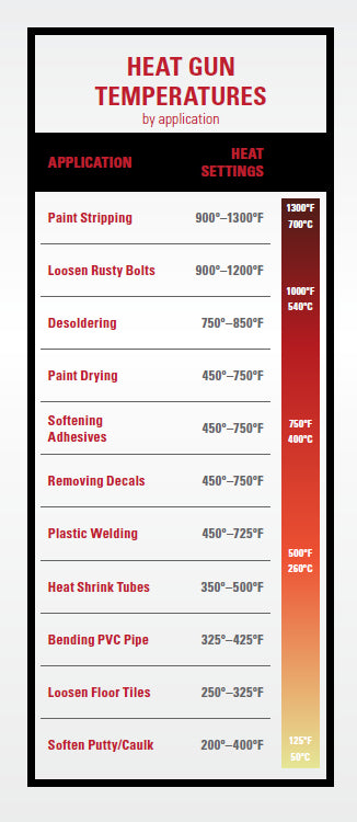 Description: The Pro V75 heat gun has a wide temperature range and variable fan settings to give the user flexibility to use it for a variety of applications including stripping paint, drying paint and spackle, heating shrink tubes, bending pipes and so much more. The kit includes 4 nozzles to help accomplish any project that requires heat.