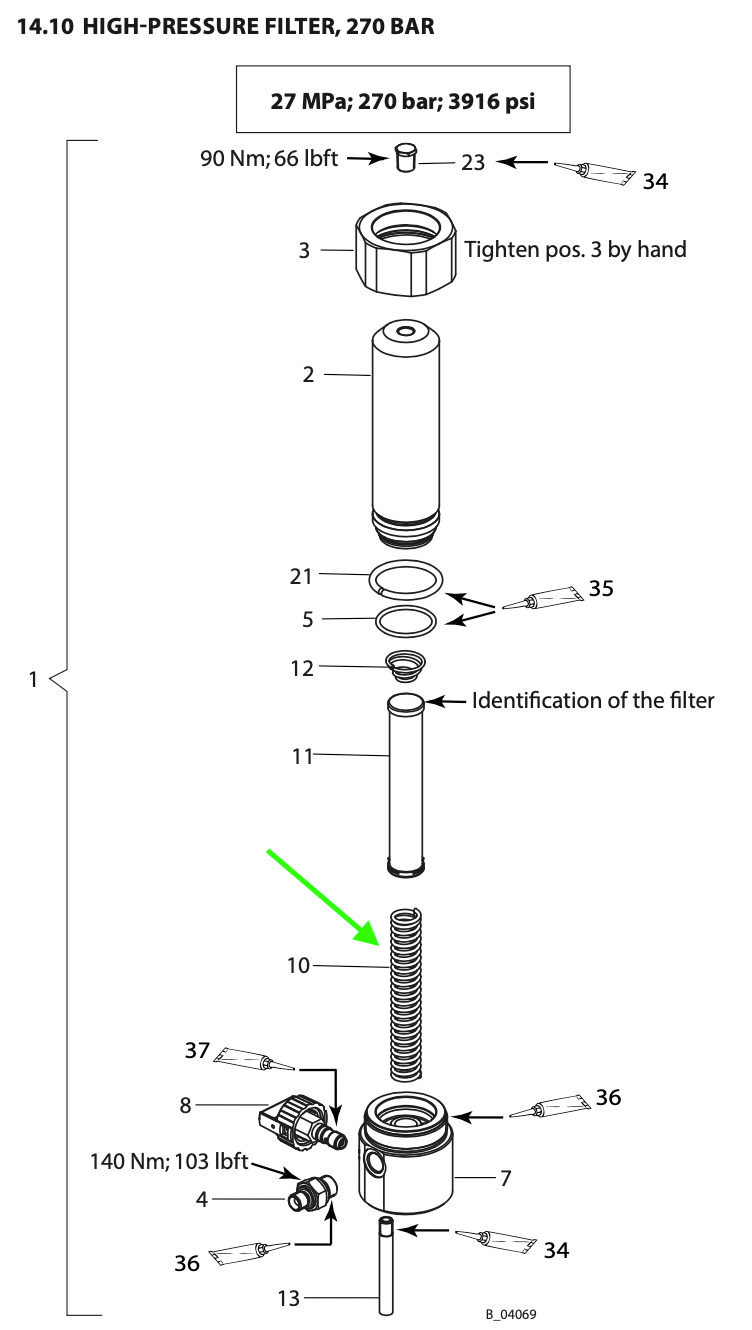 Description: Wagner High Pressure Filter Support, 270 and 530 bar (Spring, Coil, Filter Support). #10 on breakdown.
